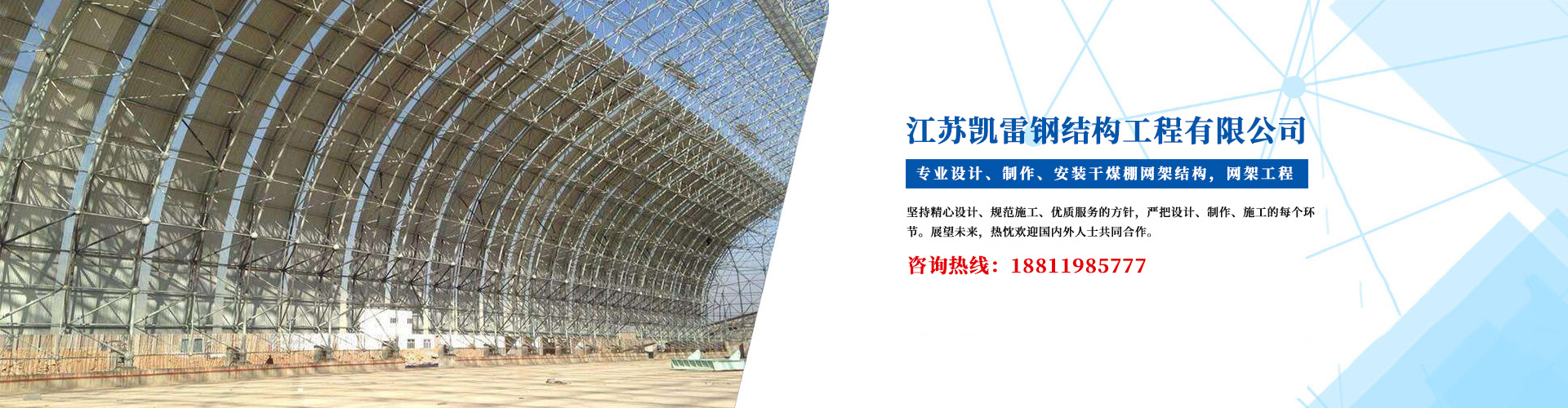 江蘇凱雷鋼結構工程有限公司是專業設計、制作、安裝網架結構,螺栓球網架,球形網架及其配件的科技進步企業。 公司擁有專業的研發設計團隊,使用先進的SFCAD、PKPM、MST、3D3S等專業鋼結構設計軟件及TEKLA、XSTEEL等詳圖設計軟件。擁有技術硬、效率高的管理團隊,嚴把設計、制作、施工的每個環節。 公司行業內率先提出網架工業電商的理念,運用互聯網思維去運營網架工程。堅持“質量為先,客戶第一”的宗旨,誠邀國、內外朋友,攜手合作,共創大業!...