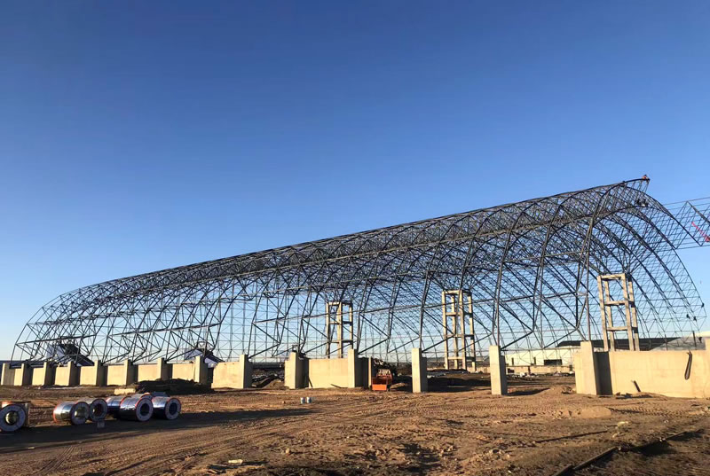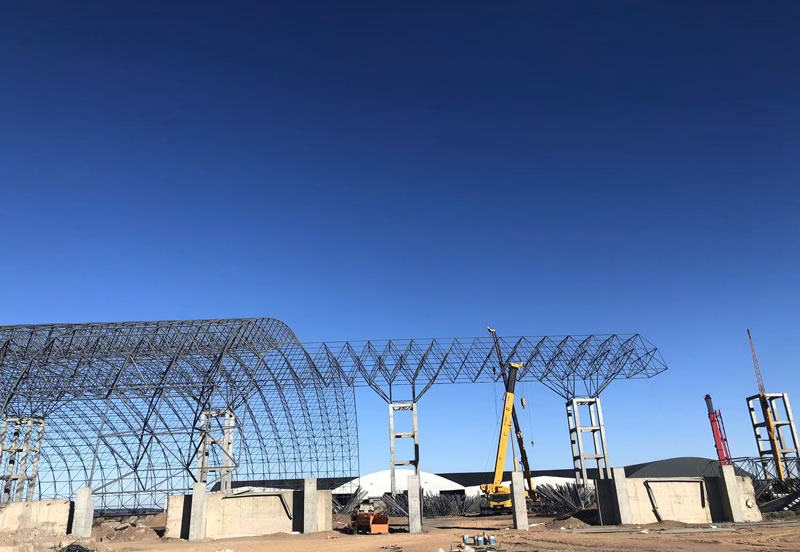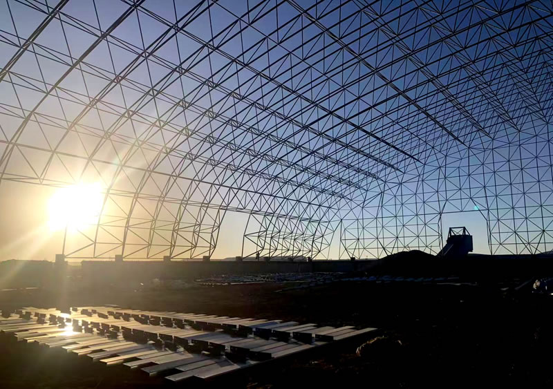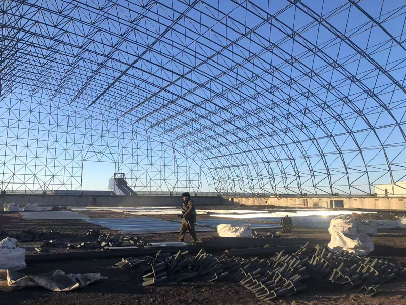 3、材料:正放四角錐螺栓球節點網架,按照甲方確認的圖紙設計要求加工制作。網架主材材質為Q355B鋼管,底漆二道70um,主檁條鍍鋅C型鋼C220*75*20*3.0,次檁條鍍鋅C型鋼C180*70*20*2.5,屋面板0.5mm厚彩鋼單板